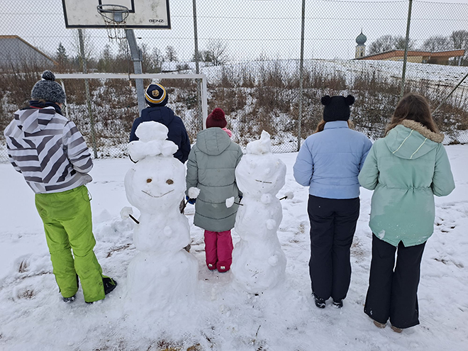 Mit vereinten Kräften rollten wir große Schneekugeln, stapelten sie vorsichtig übereinander und verzierten unseren neuen Schulfreund: Ein prächtiger Schneemann bewacht nun unseren Rodelberg! Das gemeinsame Bauen war ein wunderbarer Abschluss, bei dem jeder – ob groß oder klein – mithelfen konnte.