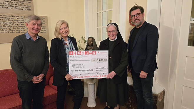 Mit großer Freude und Dankbarkeit durfte das Cabrini-Zentrum einen Spendenscheck in Höhe von 1.000 Euro entgegennehmen. Überreicht wurde dieser im Rahmen der jährlichen Ausschüttung der Bürgerstiftung Abensberg, die einmal im Jahr die aufgelaufenen Zinsen ihres Stiftungskapitals an förderwürdige Projekte vergibt.